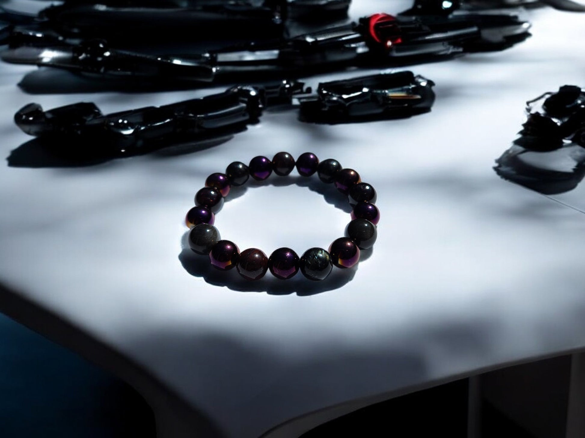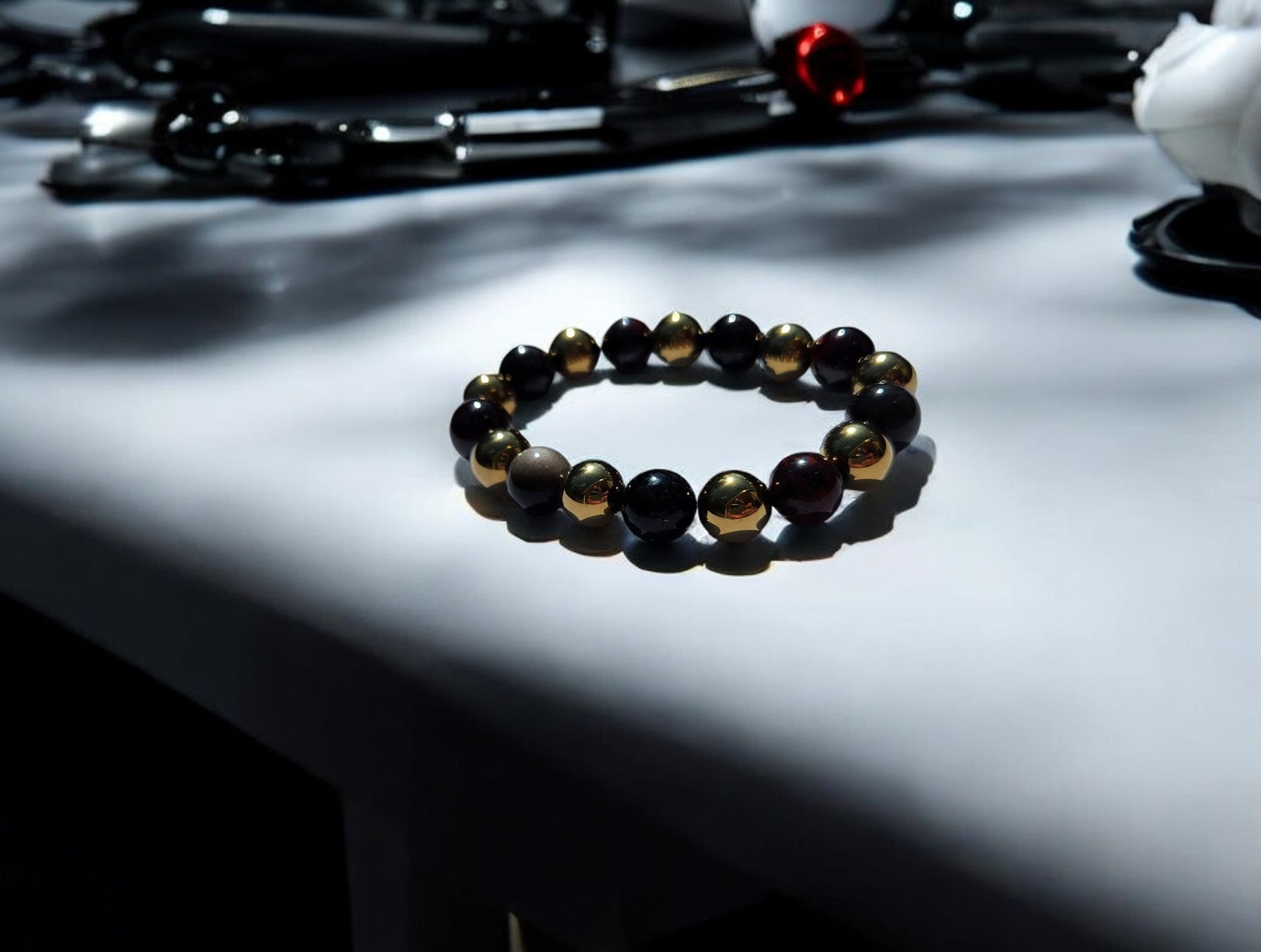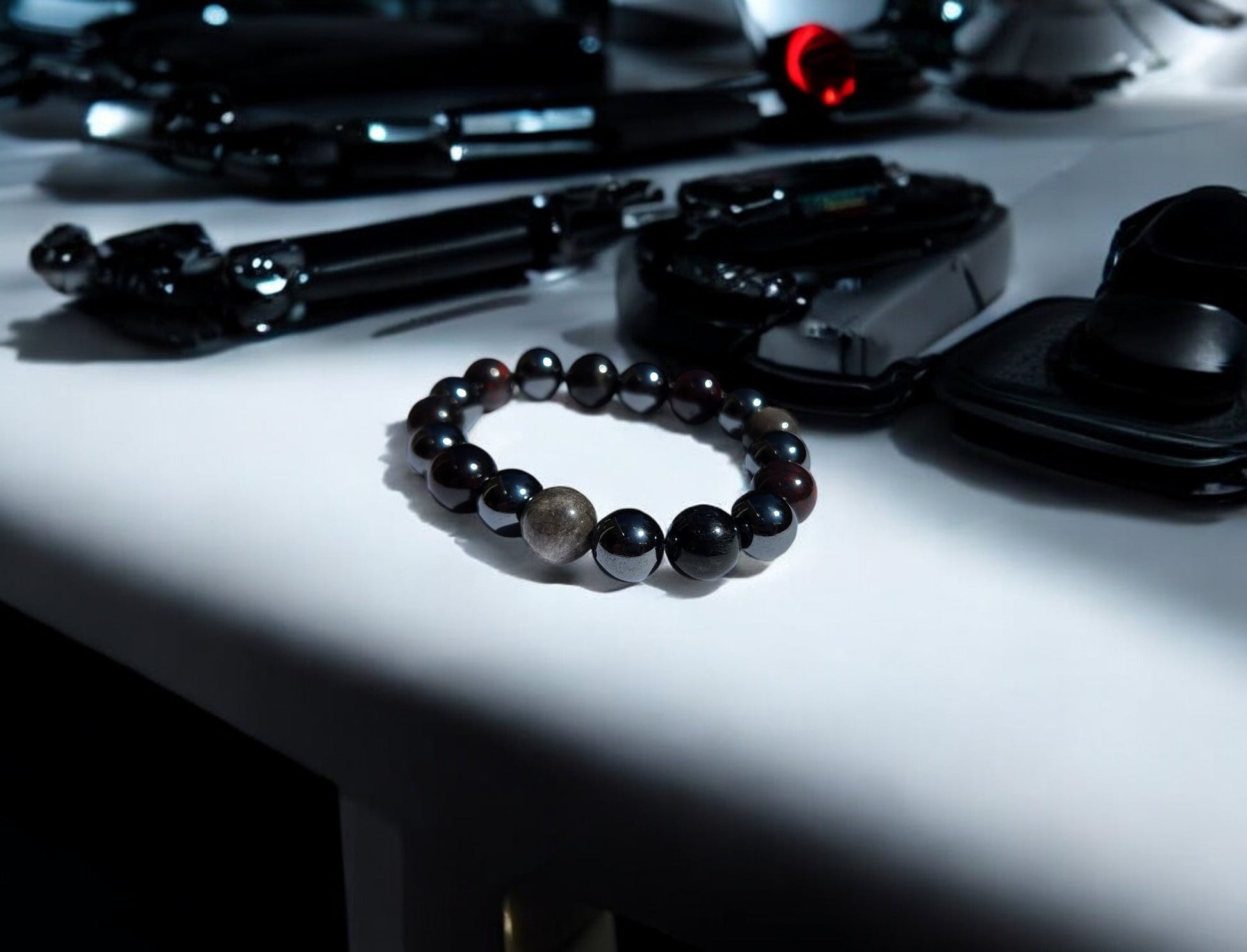 Step into the cosmic realm with our specially crafted energy band, designed to elevate your journey and enhance your cosmic connection. As beings from the Andromeda galaxy, you bring a unique energy to this world, and these crystals are here to support you every step of the way. Brecciated Jasper combines the nurturing energy of Jasper with the grounding energy of Hematite, resulting in emotional stability and mental clarity, perfect for navigating the cosmic energies. Garnet, with its amazing energy, cleanses and re-energizes the chakras, revitalizing and balancing energy, inspiring love, devotion, and self-confidence, while sharpening perceptions and removing inhibitions. Arfvedsonite calms the emotional body and maintains a cool, collective mentality, aiding in maintaining strength while processing emotions. Silver Sheen Obsidian shields against negativity, enhances patience and perseverance, and improves meditation and astral projection, grounding and alleviating deep fears. Magnetic Hematite dissolves negativity and prevents absorption of negativity from others, creating a shield against all kinds of negativity. These crystals are chosen to support Andromedan Starseeds on their journey, aiding in emotional balance, inner strength, and clarity, allowing you to navigate cosmic energies with ease and grace.